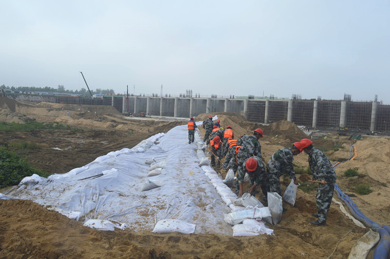 防洪度汛演練模擬的是洪水來襲,值班人員巡視圍堰時發現薄弱處有決口的危險,值班人員迅速向報告,召集搶險大隊成員攜帶防汛工具和物資迅速集結,通過填筑沙袋、拋石、打樁等措施消除圍堰隱患,保證了工程安全。