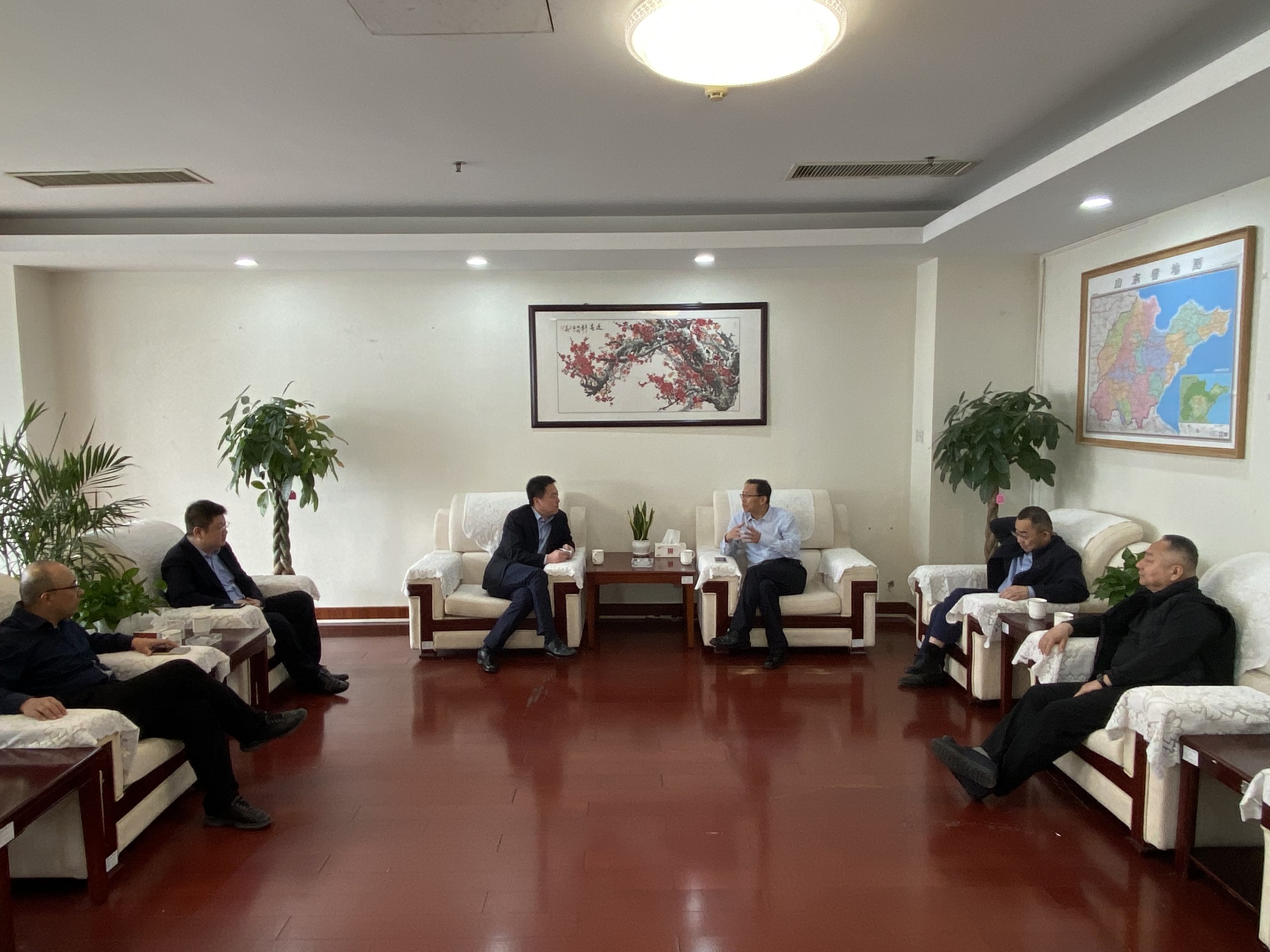 隨后,靳文碩等一行到青島區域協同發展辦公室同李丕明主任進行座談交流。李丕明對靳文碩一行表示熱烈歡迎,并對水總在青島區域的投資建設給予大力支持,希望雙方在此基礎之上再進行深入探討,力爭實現更深層次的合作發展。