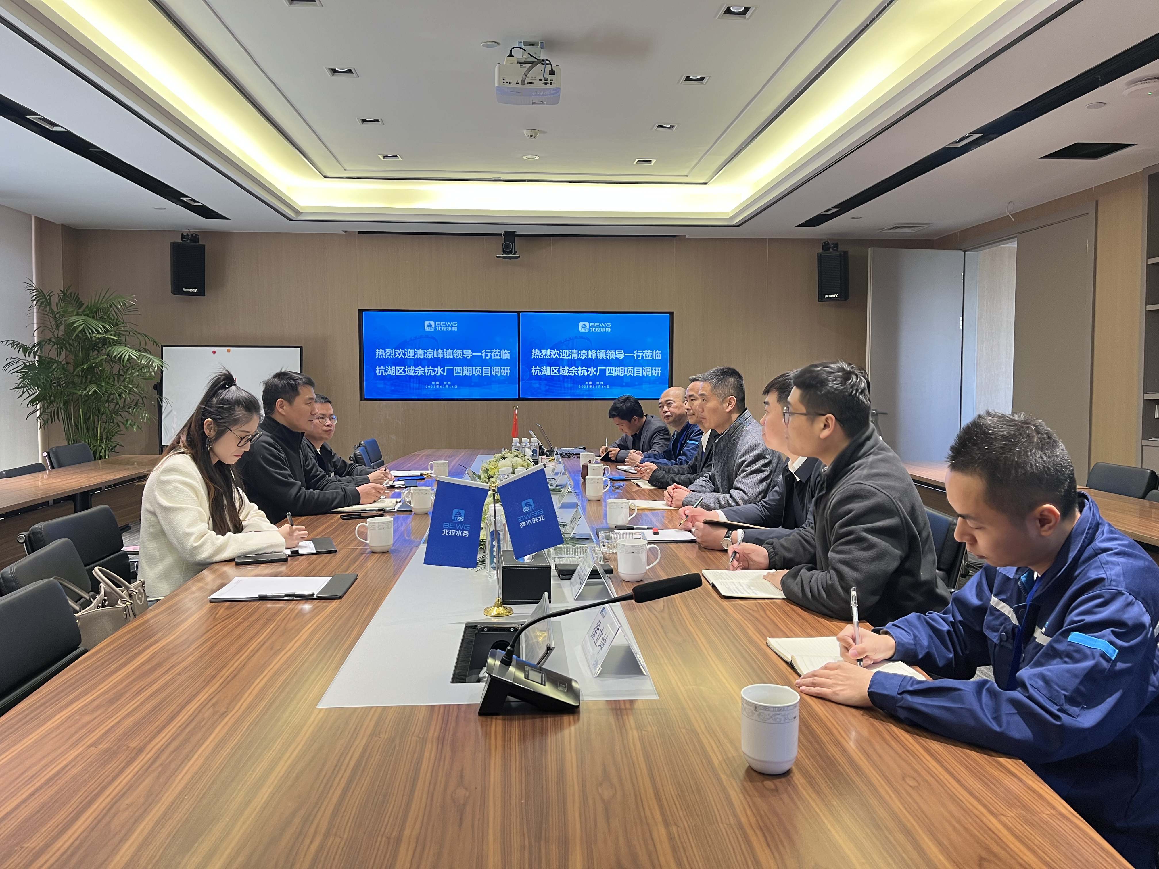 3月14日,杭州魯潤公司聯合臨安區清涼峰鎮政府黨委副書記、鎮長卞迎翔一行到訪北控水務集團杭湖區域公司余杭水廠四期項目參觀調研。三方就清涼峰鎮污水處理廠項目合作事宜進行充分交流。