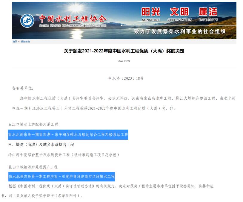近日,中國水利工程協(xié)會發(fā)布《關(guān)于頒發(fā)2021-2022年度中國水利工程優(yōu)質(zhì)(大禹)獎的決定》,我公司參建的南水北調(diào)東線第一期工程濟南~引黃濟青段濟南市區(qū)段輸水工程和南水北調(diào)東線一期南四湖~東平湖段輸水與航運結(jié)合工程鄧樓泵站工程榮獲此項殊榮。