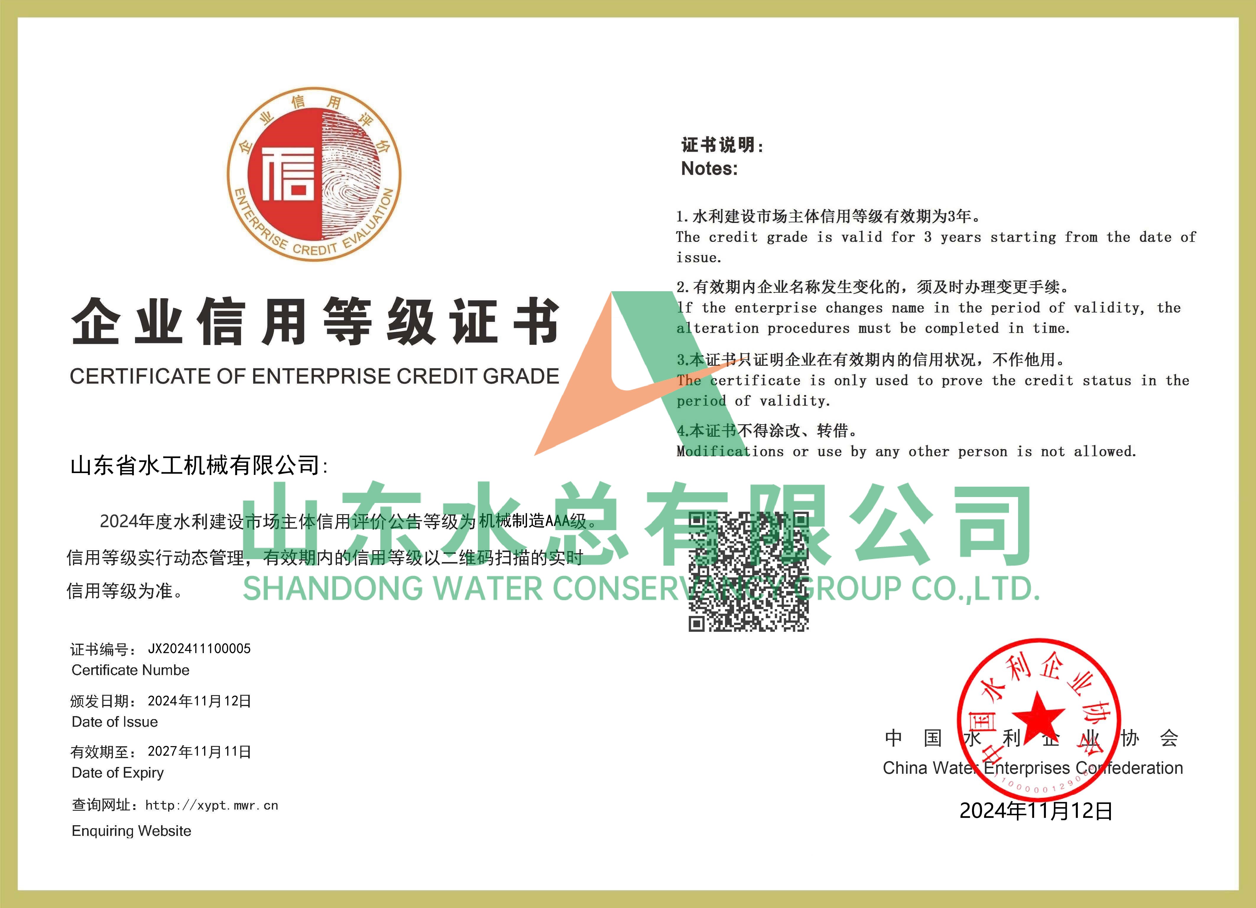 水工機械公司獲全國水利建設市場AAA主體信用評價