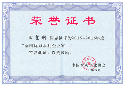 公司刁望利同志榮獲2015-2016年度“全國優秀水利企業家”