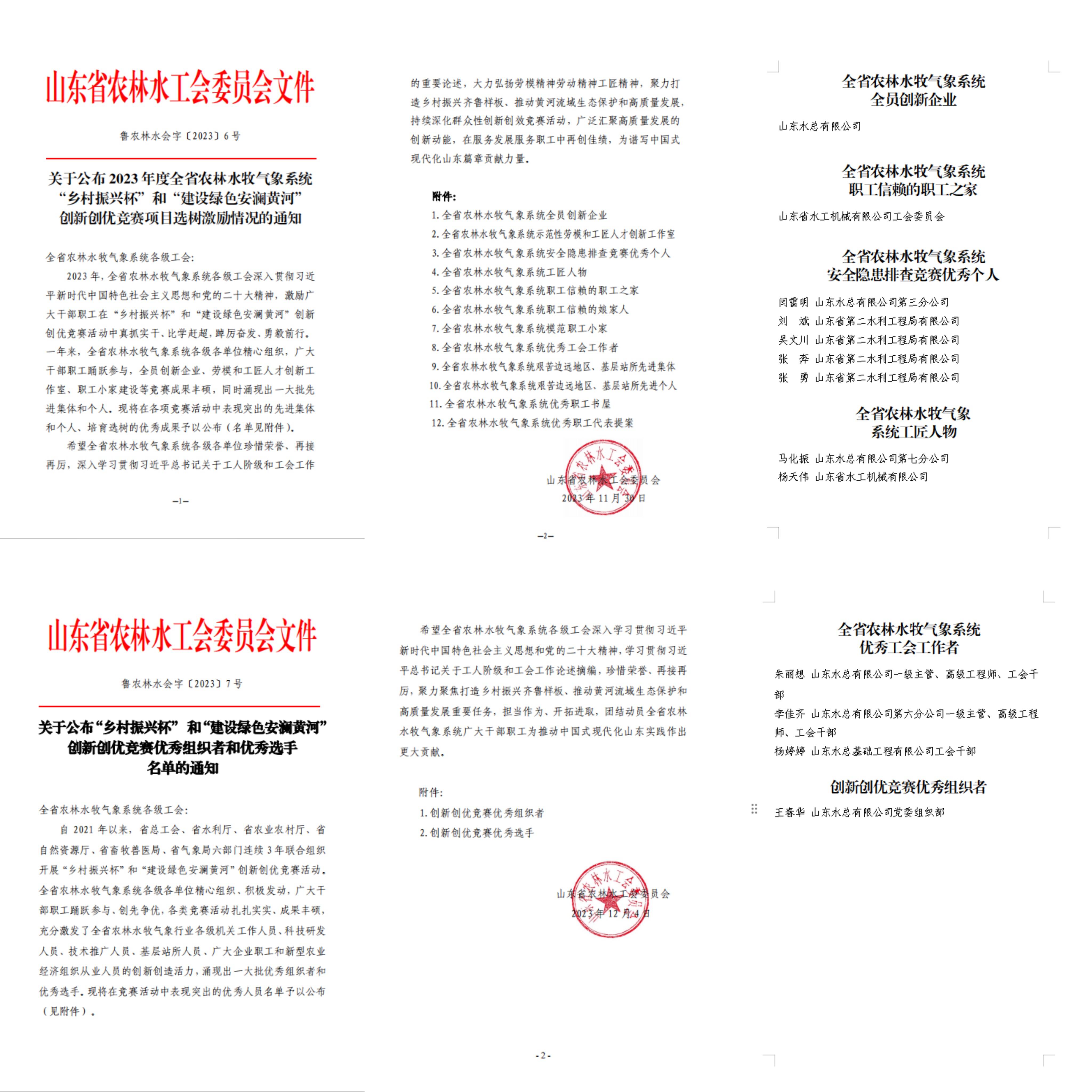 近日,山東省農(nóng)林水工會下發(fā)了《關(guān)于公布 2023 年度全省農(nóng)林水牧氣象系統(tǒng)“鄉(xiāng)村振興杯”和“建設(shè)綠色安瀾黃河”創(chuàng)新創(chuàng)優(yōu)競賽項目選樹激勵情況的通知》《“鄉(xiāng)村振興杯” 和“建設(shè)綠色安瀾黃河”創(chuàng)新創(chuàng)優(yōu)競賽優(yōu)秀組織者和優(yōu)秀選手名單的通知》,山東水總榮獲全省農(nóng)林水牧氣象系統(tǒng)全員創(chuàng)新企業(yè),水工機械公司工會榮獲“職工信賴的職工之家”,11人分別榮獲“職工安全隱患排查競賽優(yōu)秀個人”“工匠人物”“優(yōu)秀工會工作者”“創(chuàng)新創(chuàng)優(yōu)競賽優(yōu)秀組織者”等稱號。